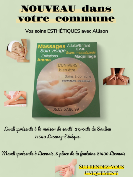 Esthéticienne Moulin de Mortaise27 route de Saulieu71540 LUCENAY L EVEQUEmoc.liamg@erteneibsrevinul.ueiluas99 68 75 30 60